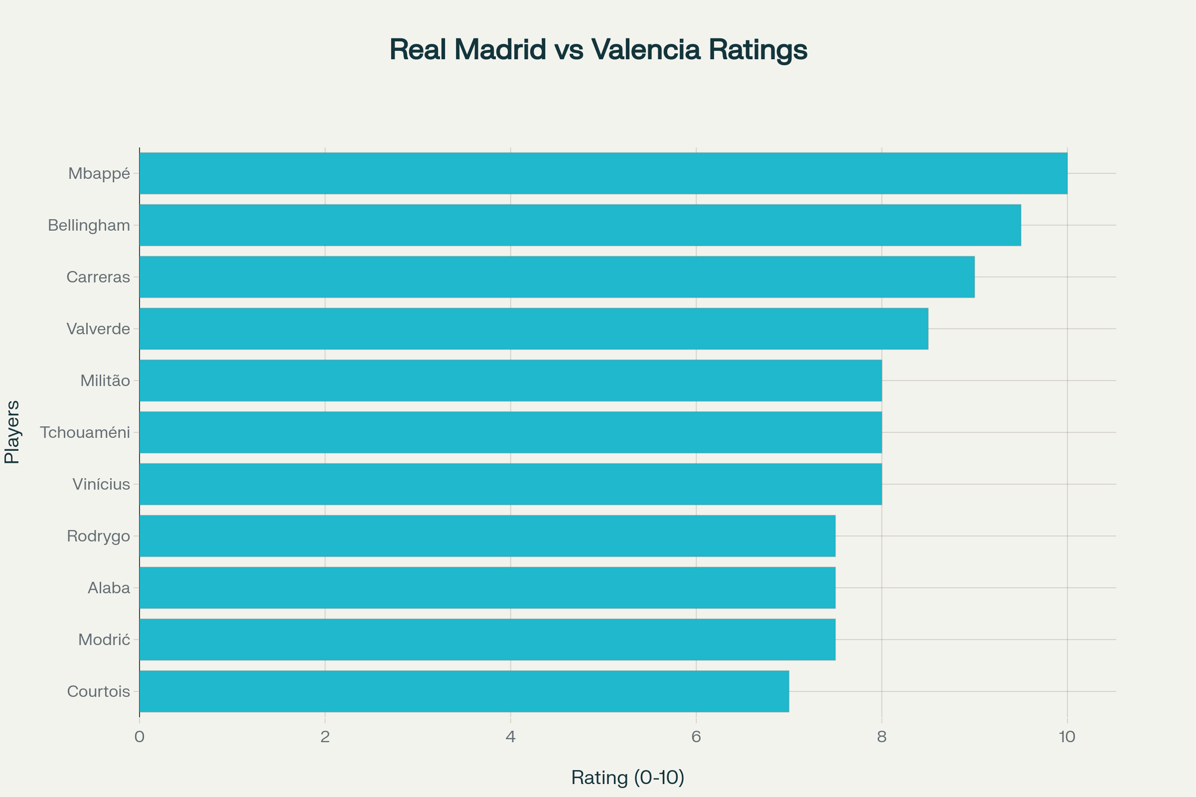 في تقييم لاعبي ريال مدريد امام فالنسيا، حصل كيليان مبابي على الدرجة الكاملة 10/10 لدوره الحاسم في الهجوم، حيث لم يضيع أي كرة وأظهر سرعة فائقة في التحركات، بينما جود بيلينغهام 9.5/10 بفضل هدفه ومساهمته في بناء الهجمات بـ5 تمريرات حاسمة. أما ألفارو كاريراس، الذي سجل أول هدف له، فحصل على 9/10 لدفاعه القوي وتسديدته المذهلة من الجهة اليسرى، متفوقًا في 7 تداخلات دفاعية. في الوسط، فيدي فالفيردي 8.5/10 بطاقته اللانهائية وتغطيته للمناطق، وأوريلين تشواميني 8/10 لدوره الدفاعي الهادئ، رغم خطأ بسيط في التمرير أدى إلى هجمة معاكسة. ألابا 7.5/10 في الدفاع بجانب ميليتاو الذي حصل على 8/10 لإيقافه المهاجمين، بينما رودريغو 7.5/10 لمساهماته الجانبية، وفينيسيوس 8/10 بسرعته التي أرهقت الخصم، رغم إهدار فرصة واضحة. كورتوا 7/10 في الحراسة، حيث لم يختبر كثيرًا لكنه تصدى لتسديدة خطيرة في الشوط الثاني.