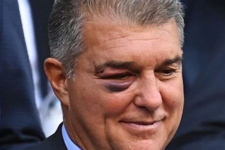 حيث وصل رئيس برشلونة للملعب مرتديًا نظارات شمسية، لكن بعد خلع لابورتا نظارته لتحية رونالدو ظهرت عينه للجمهور ، لينكشف نقاب عن الصور الصادمة ، لتظهر بعد ذلك عينه عليها أثار الضرب ، كدمات متورمة تحث العين .